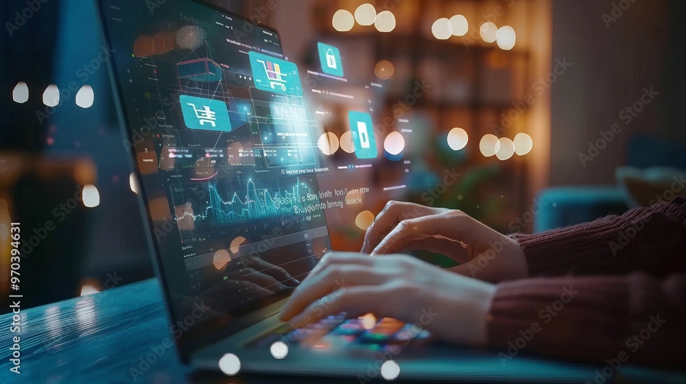 Wall mural online shopping concept featuring hands typing on a keyboard with virtual store interface, perfect f - Wall murals Wall mural online shopping concept featuring hands typing on a keyboard with virtual store interface, perfect f - Wall murals