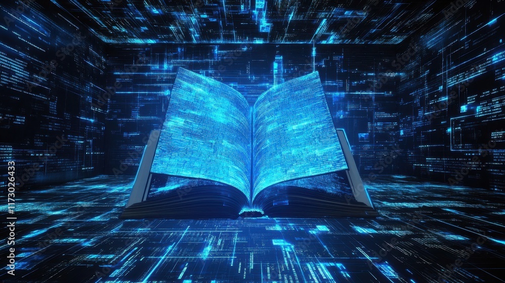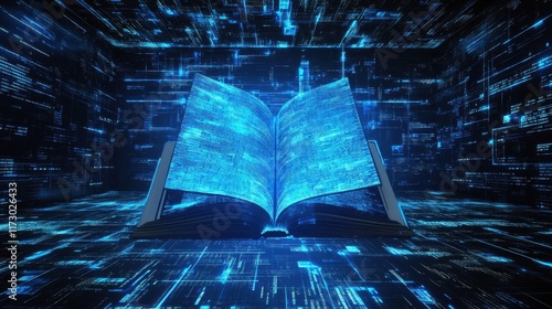 The watermark will not be included on Wall mural.: Open book with digital data visuals in futuristic environment