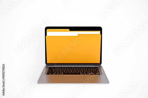 Wall mural open laptop with yellow folder icon on screen. 3d rendering