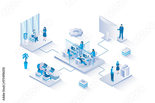 Open space office 3d isometric concept with isometry people design for web - employees working in cowWall mural
