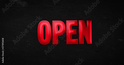 Wall mural : Open - glossy red word is zoomed into focus - text intro/opener on background (black) - 4k animation