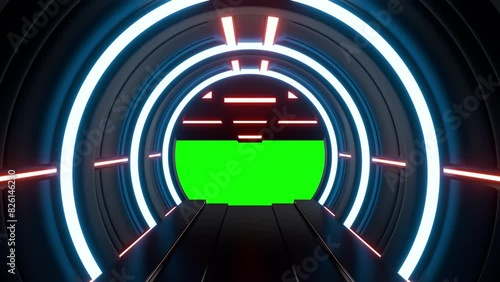 Opening gate or door in dark futuristic tunnel spaceship or science laboratory corridor - sci-fi conWall mural