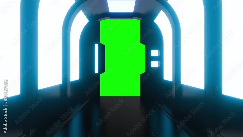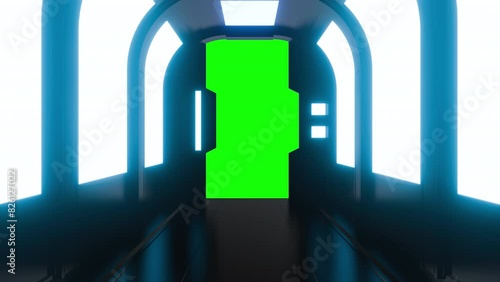 The watermark will not be included on Wall mural.: Opening gate or door in dark futuristic tunnel spaceship or science laboratory corridor - sci-fi con