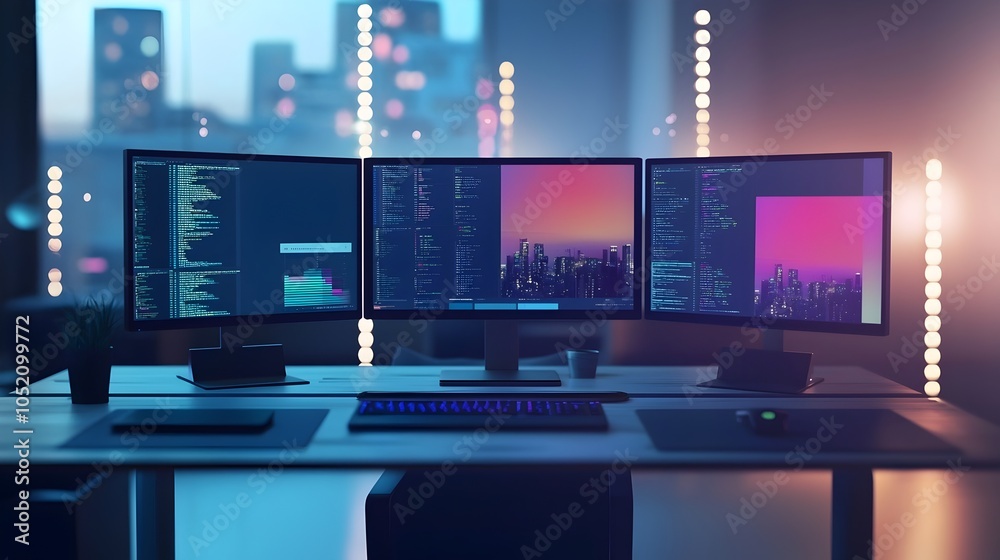Wall mural optimized virtual workspace with multi monitor setup for enhanced productivity - Wall murals Wall mural optimized virtual workspace with multi monitor setup for enhanced productivity - Wall murals