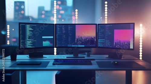 Wall mural : Optimized virtual workspace with multi monitor setup for enhanced productivity