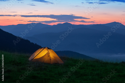 The watermark will not be included on Wall mural.: Orange tourist tent illuminated from inside on mountain