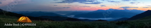 The watermark will not be included on Wall mural.: Orange tourist tent illuminated from inside stands in mountains above clouds