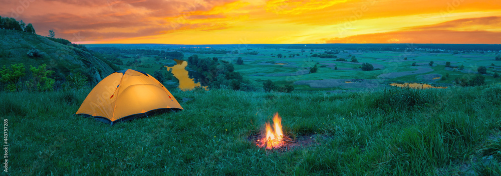 The watermark will not be included on Wall mural.: Orange tourist tent on hill above river under orange dramatic sky