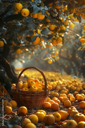 Orchard with yellow apples, a basket with large apples stands under a tree, sunlight passes through Wall mural