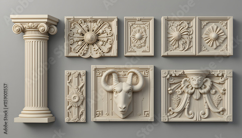 The watermark will not be included on Wall mural.: Ornate architectural elements including columns and reliefs in classical style on a gray background