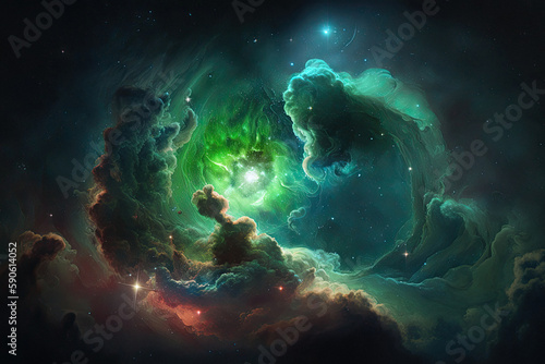 Wall mural : Outer space nebula, stars and green galaxy combination with form fractal design