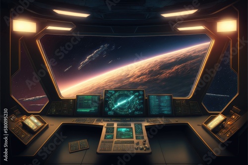 Wall mural outer view of spaceship window with control system room. abstract discover new planet in space. fine - Wall murals Wall mural outer view of spaceship window with control system room. abstract discover new planet in space. fine - Wall murals