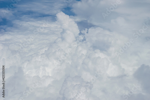 Wall mural over the clouds,blue sky with tiny clouds background beautiful natural view from airplane window abo
