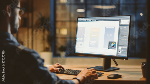 The watermark will not be included on Wall mural.: Over the shoulder shot of a young app developer using desktop computer, creating new mobile phone ap
