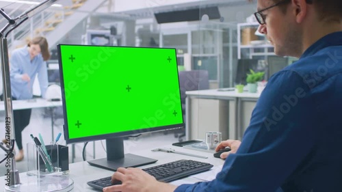 The watermark will not be included on Wall mural.: Over the shoulder shot of engineer working with green mock-up screen desktop computer - in the backgr