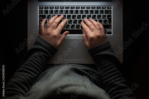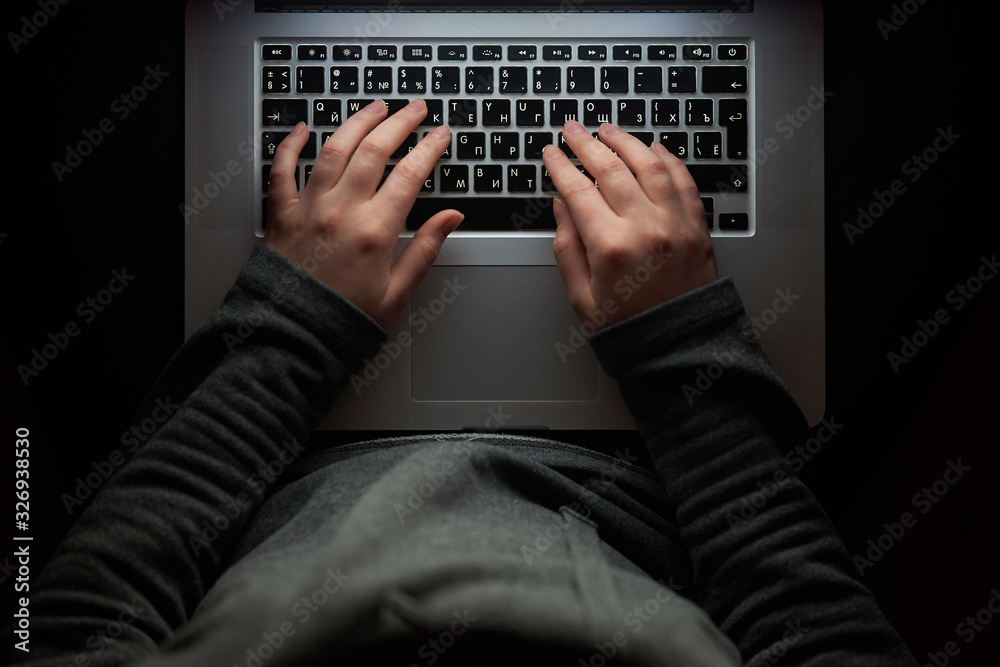 Wall mural overhead hacker in the hood working with laptop and mobile phone typing text in the darkroom. russia - Wall murals Wall mural overhead hacker in the hood working with laptop and mobile phone typing text in the darkroom. russia - Wall murals