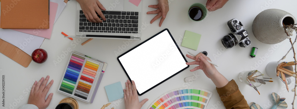 The watermark will not be included on Wall mural.: Overhead shot of designer team consulting on their project in minimal workspace