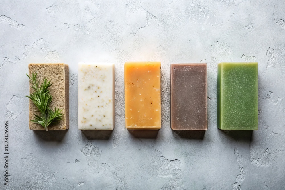 Overhead view of colorful rectangular soap bars on light gray background - aesthetic product photogrWall mural
