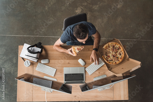 Wall mural : Overhead view of programmer eating pizza and using computers at workplace