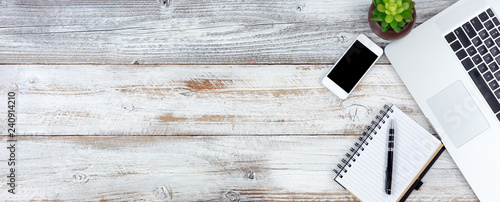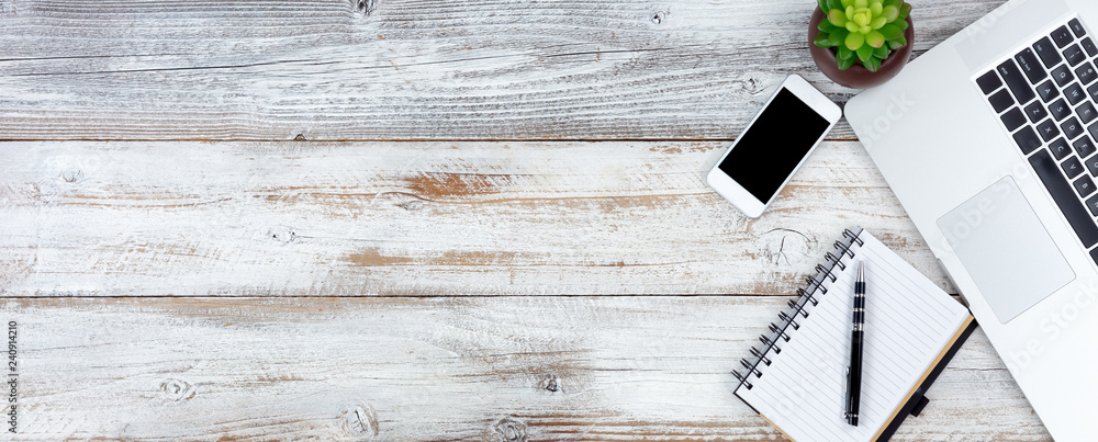 The watermark will not be included on Wall mural.: Overhead view of white rustic desk with laptop computer and work related items