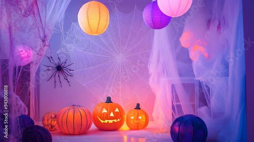 The watermark will not be included on Wall mural.: Oversized spider web with floating decorations in a pastel vignette