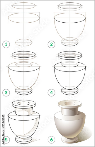 Wall mural page shows how to learn step by step to draw antique vase. vector image.