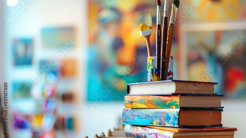 Wall mural paintbrushes in a jar on top of a stack of books in a colorful art studio. - Wall murals Wall mural paintbrushes in a jar on top of a stack of books in a colorful art studio. - Wall murals