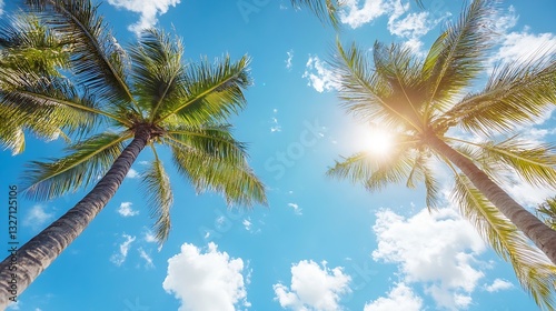 Wall mural : Palm trees against bright blue sky with fluffy clouds and vibrant sunlight streaming through : gener