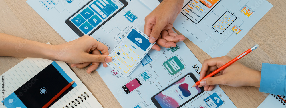 The watermark will not be included on Wall mural.: Panorama banner of startup company employee planning on user interface prototype for mobile applicat