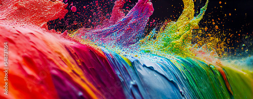 The watermark will not be included on Wall mural.: Panorama exploding liquid paint in rainbow colors with splashes header 10 generative ai illustration