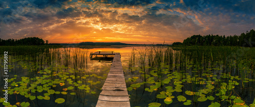 The watermark will not be included on Wall mural.: Panorama of beautiful sunrise over lake