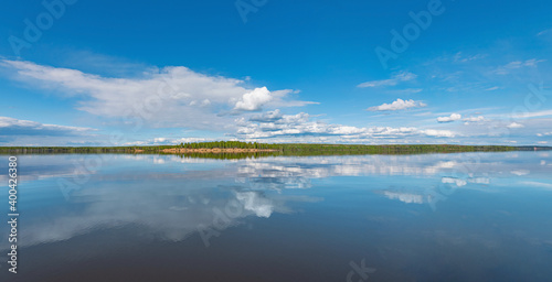 Wall mural panorama of calm lake, kama river blue sky with clouds reflected in the water.