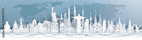 Wall mural panorama postcard and travel poster of world famous landmarks of europe, asia and america in paper c