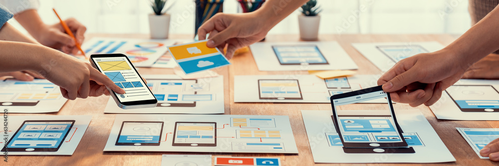 The watermark will not be included on Wall mural.: Panorama shot of front-end developer team brainstorming ui and ux designs for mobile app on paper wi