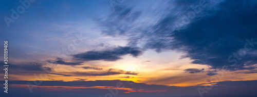 Wall mural panorama sunlight with dramatic sky. cumulus sunset clouds with sun setting down on dark background.
