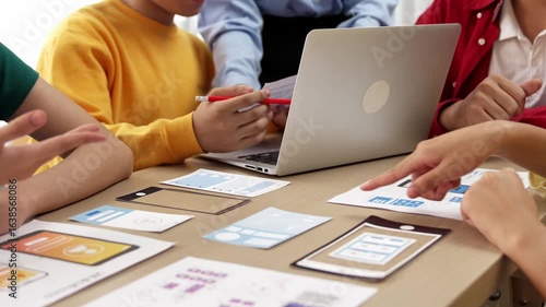 The watermark will not be included on Wall mural.: Panorama video of startup company employee planning on user interface prototype for mobile applicati