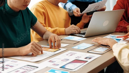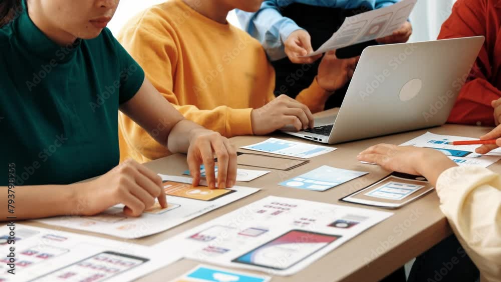 The watermark will not be included on Wall mural.: Panorama video of startup company employee planning on user interface prototype for mobile applicati