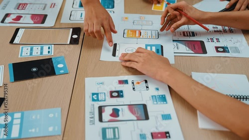 The watermark will not be included on Wall mural.: Panorama video of startup ux developer or company employee design user interface or ui prototype for