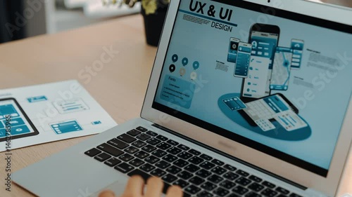 The watermark will not be included on Wall mural.: Panorama video of startup ux developer or company employee using laptop design user interface or ui