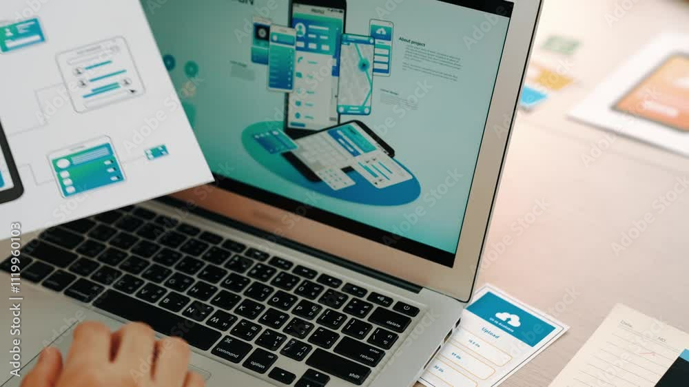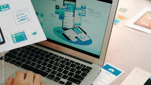 The watermark will not be included on Wall mural.: Panorama video of startup ux developer or company employee using laptop design user interface or ui