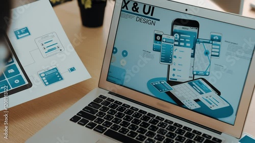 The watermark will not be included on Wall mural.: Panorama video of startup ux developer or company employee using laptop design user interface or ui