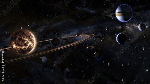Wall mural : Panoramic solar system alignment - planets aligned in outer space exploration and astronomy concept