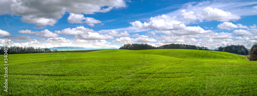 Wall mural panoramic view fields winter wheat at hilly terrain in spring with cloudy sky