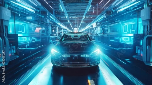 Wall mural : Panoramic view of a car manufacturing plant showing automated assembly line, high-tech robotics in a