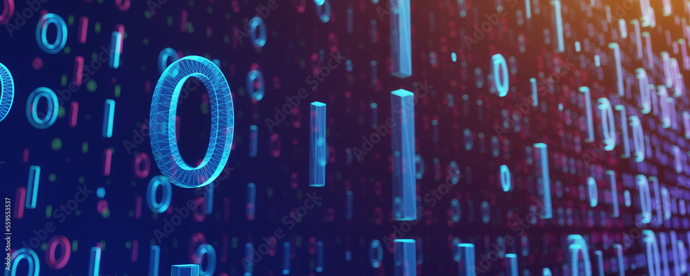 Wall mural panoramic view of binary code on blue background. abstract technology futuristic digital background.