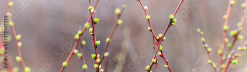 The watermark will not be included on Wall mural.: Panoramic view of branches on bokeh background in early spring