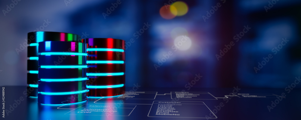 Wall mural panoramic view of multiple database is placed on relational database tables with server room backgro - Wall murals Wall mural panoramic view of multiple database is placed on relational database tables with server room backgro - Wall murals