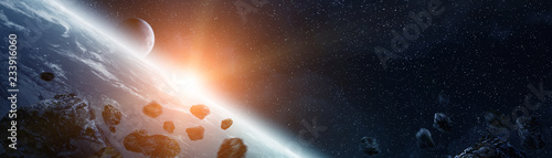 Wall mural panoramic view of planet earth with asteroids flying close 3d rendering elements of this image furni - Wall murals Wall mural panoramic view of planet earth with asteroids flying close 3d rendering elements of this image furni - Wall murals