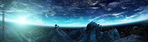 Wall mural : Panoramic view of planet earth with asteroids flying close 3d rendering elements of this image furni