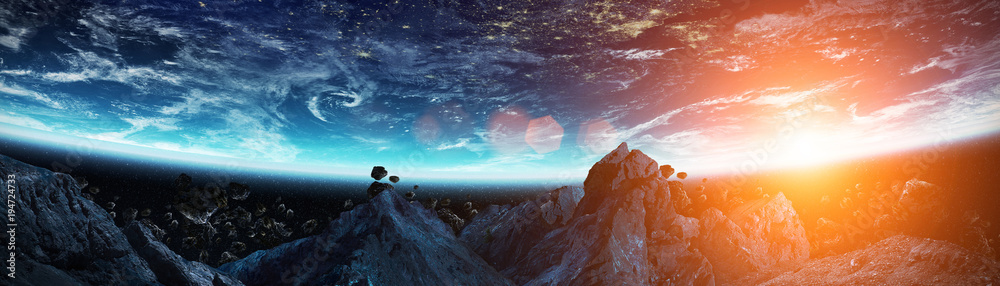 Wall mural panoramic view of planet earth with asteroids flying close 3d rendering elements of this image furni - Wall murals Wall mural panoramic view of planet earth with asteroids flying close 3d rendering elements of this image furni - Wall murals